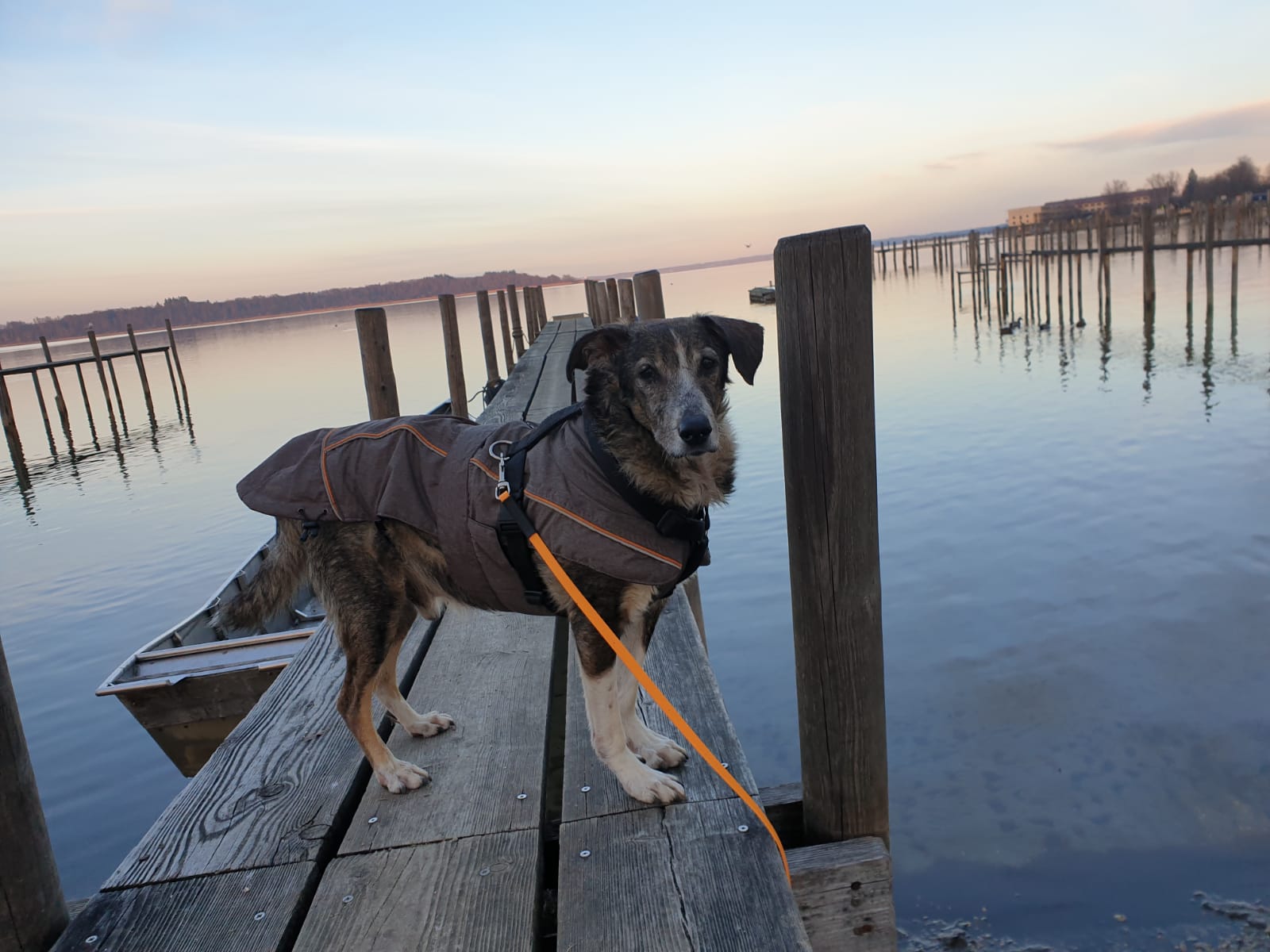Conny fuhr mit Paddy nach Felden und parkte am Parkplatz der Fischerei Minholz. Paddy freute sich über den Ausflug und schnüffelte gleich den Parkplatz ab. Dann gingen die beiden weiter am Medicalpark vorbei über die Birkenallee. Paddy traf mehrere Hunde und begrüßte alle freundlich. Da mittlerweile viele Menschen unterwegs waren, gingen Conny und Paddy in Richtung Prien und machten einen kleinen Rundgang zurück nach Felden. Paddy grinste über das ganze Gesicht und fand es richtig klasse 🙂 Am Auto angekommen ging Paddy direkt daran vorbei in Richtung Chiemsee, also machten sie noch einen Abstecher dorthin. Es war ein wunderschöner Ausflug. 🙂