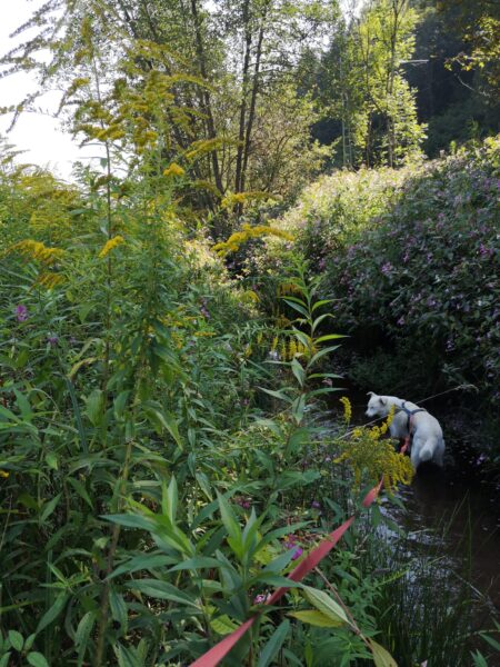 Karin fuhr mit Sam nach Rottau, wo sie bei der Kneippanlage unterwegs waren. Sam schnüffelte entspannt am Wegesrand, die paar Radfahrer waren mit etwas Abstand gar kein Thema für Sam. Als zwei Reiter vorbei kamen, wichen sie weiter in die Wiese aus, danach schaute Sam den Pferden vom Weg aus noch eine Weile nach, blieb dabei aber ruhig, er fand es einfach nur beobachtenswert. 🙂 Gut gelaunt frischte er sich im Bach ab und freute sich über eine Leckerliesuche und viele Kuschelmomente mit Karin, bevor sich die beiden wieder auf den Rückweg machten. 🙂