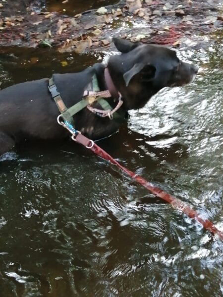Anschließend gingen Jutta und Renate mit Momo und Aika in Richtung Übersee. Momo und Aika hatten eine gute Zeit, schnüffelten viel am Wegesrand und plantschten gerne, wenn auch im recht dreckigen Wasser. Als sie schon auf dem Rückweg waren, donnerte es ein paar Mal, was Momo etwas verunsicherte. Da es danach aber wieder ruhig war, konnten sie trotzdem entspannt wieder zurückgehen und genossen auch den Rest des Spaziergangs. 🙂
