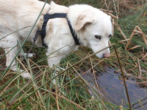 Mit Percy ging Robert auf die große Wiese. Robert legte ihm im Zimmer sein Geschirr an und ließ ihn gemeinsam mit Nicky und Laluna in den Hof. Dort schnüffelten alle zusammen herum, bis Robert ihn anleinte und es losgehen konnte. Percy ging gut mit, aber man merkte ihm schon an, dass er gerne wieder zurück wollte. Auf der Wiese war Percy schon entspannter und freute sich über eine Leckerliesuche, die er schnell abschnüffelte. 🙂