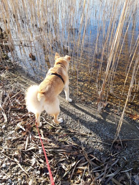 Renate machte mit Rosie einen schönen langen Spaziergang zum Chiemsee. Rosie lief fröhlich schnüffelnd mit und am See pritschelte sie ein wenig im Wasser und lachte Renate an. 🙂 Auch auf dem Rückweg fand Rosie noch viele interessante Duftspuren, denen sie nachging und natürlich wurde zwischendurch auch ein wenig gekuschelt. 🙂
