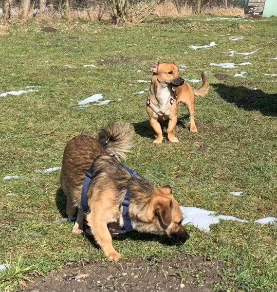 Rosalie und Diego hatten ebenfalls viel Spaß, als Ben mit ihnen auf die große Wiese ging. Übermütig wälzten sie sich und pflügten mit der Nase durch den Schnee. Wenn sie Pausen machten, ließen sich beide gern von Ben streicheln. Alle drei kamen mit lachenden Gesichtern zurück. 🙂
