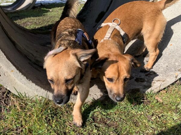 Mit Paul und Robin waren Em und Elfriede auf dem Hundeplatz. Die Jungs hatten viel Spaß, wobei Robin sich sehr an Paul orientierte. Wenn der sich auf die verschiedenen Geräte traute, ging er mit, war Paul außer Sicht, war er eher unsicher. Das Ein- und Aussteigen ins TierHeimauto klappte ganz gut, zur Rückfahrt sprangen sie von selbst rein, denn sie hatten sich ausgepowert und wollten gerne wieder zurück. 🙂