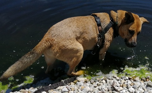 Mit Aika ging Jutta zu den Weihern bei der Raststätte und dann noch weiter bis zum Waldweg. Die beiden hatten viel Spaß, Aika plantschte im Wasser, schnüffelte am Wegesrand, suchte nach Leckerlies und auf Höhe der Raststätte verbellte sie einen großen Hund, der zu nah auf der anderen Zaunseite stand. Ansonsten war es ein schöner und entspannter Spaziergang. 🙂