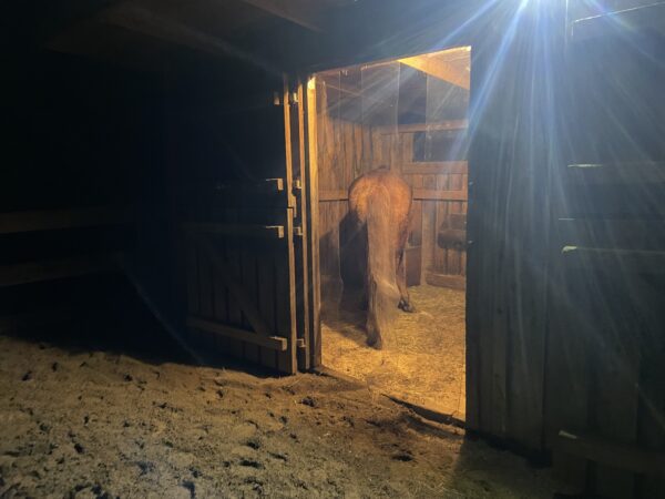 Michi striegelte am Morgen Wallace und Gowinda und machte ihnen die Hufe sauber, danach gab es Frühstück. Michi machte ihnen wieder die Weide auf, aber sie blieben lieber auf dem Paddock. Nachmittags fuhr Michi nochmal hoch zum Stall, um Lamellenvorhänge vor den Stalltüren zu montieren, damit es in den Boxen nicht so zieht und wärmer bleibt. Die Lamellen waren ihnen erst unheimlich, sie wagten sich nicht hinein in den Stall, aber als Michi abends wieder zu ihnen fuhr, standen beide drinnen. Sie haben sich sehr schnell an die neuen Vorhänge gewöhnt. 🙂