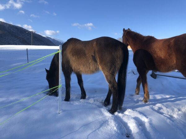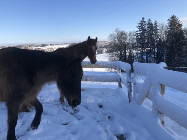 Am Stall war es bitterkalt heute morgen und es fegte ein eisiger Wind. Wallace und Gowinda macht die Kälte aber nichts aus, sie warteten schon auf Michi und begrüßten sie freundlich. 🙂 Unter ihrer Mähne durfte sich Michi immer wieder ihre Finger wärmen. 😉 Michi striegelte beide und machte ihre Hufe sauber, danach waren sie auf der Weide. Als Michi mittags hoch fuhr, standen beide bereits im Stall und knabberten am Heu. Nachdem für den Nachmittag schlechteres Wetter angesagt war, schloss Michi den Zugang zur Weide. Abends war Lukas im Stall und versorgte die Pferde. 🙂