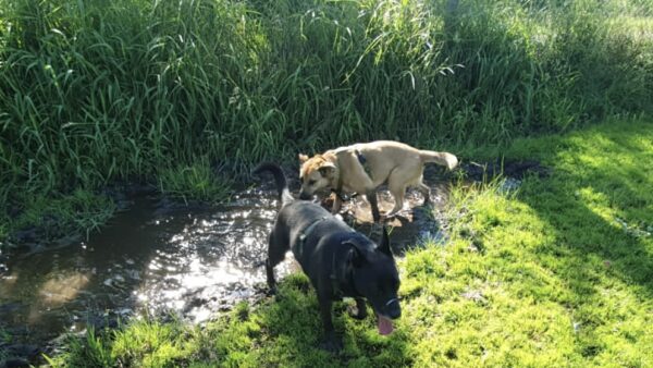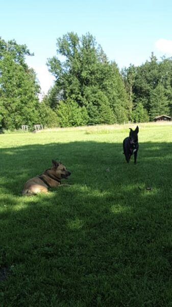 Danach fuhr David mit Latjak und Valentina auf den Hundeplatz. Die zwei genossen es, endlich mal wieder im Freilauf unterwegs zu sein. Sie sausten von einem Emde zum anderen und kühlten sich zwischendurch in der großen Pfütze ab. 🙂