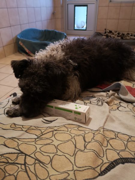 Paddy und Mogli freuten sich über einen Spaziergang mit Karin. Die beiden sind so niedlich! 🙂 Paddy trabte flott voraus, während Mogli den Wegesrand abschnüfffelte. Da Paddy immer wieder anhielt, um zu markieren und zu scharren, konnten Karin und Mogli gut aufschliessen. Am Stromhäuschen haben die beiden viel geschnüffelt und an der zweiten Bank hat Karin Mogli eine Leckerliesuche ausgelegt. Während Mogli suchte, warf Karin Paddy Leckerlies zu, die er gekonnt aus der Luft schnappte. Zurück im Zimmer kuschelte Karin lange mit den beiden. Paddy ließ sich die Pfoten und die Ohren eincremen – eine Salbe für die Regeneration von irritierter Haut – und Mogli legte sich auf Karin’s Bein und kuschelte mit ihr. 🙂