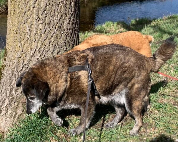 Mit Kaya gingen Fred und Dagmar zu den Weihern bei der Raststätte und von dort aus weiter bis zum Waldweg. Kaya war richtig gut drauf, lief entspannt schnüffelnd den Weg entlang und genoss die vielen Streicheleinheiten von Dagmar und Fred sehr. Gut gelaunt kamen die drei zurück ins TierHeim, wo sich Kaya mit einem Lachen von den beiden verabschiedete. 🙂