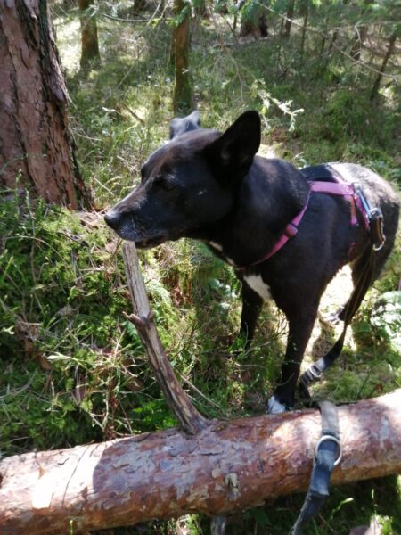 Jutta ging mit Momo in Richtung Übersee. Dabei schauten sie auf dem Waldweg vorbei und machten wie gewohnt einen Abstecher zum kleinen Bach, wo Momo sich die Pfoten abfrischte. Die Leckerchen, die Jutta unterwegs für sie versteckte, fand sie ruck-zuck und sie freute sich über eine lange Kuschelpause. 🙂