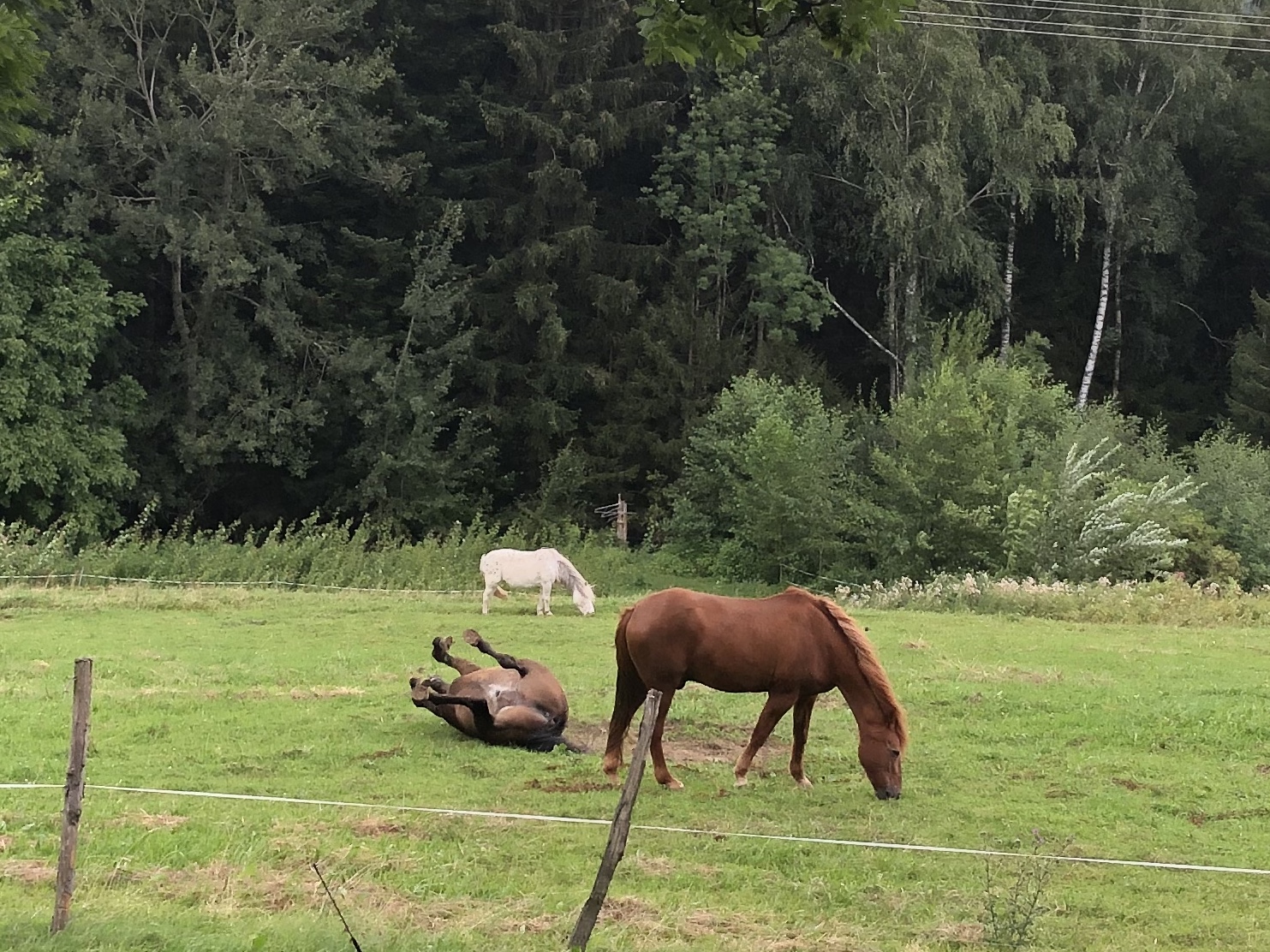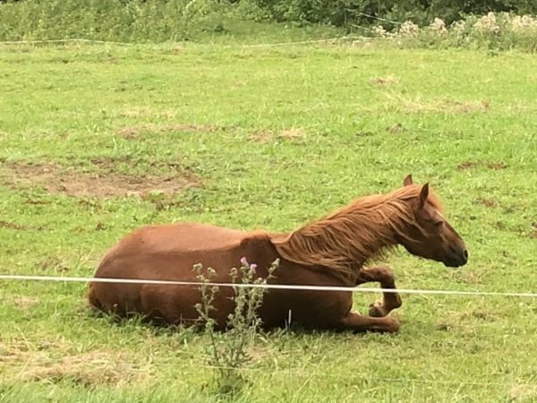 Michi striegelte am Morgen alle Pferde und machte ihnen die Hufe sauber, bevor sie auf die Weide raus gingen. Obwohl es regnete, verbrachten alle tagsüber viel Zeit auf der Wiese. Sie genossen es, sich im nassen Gras zu wälzen und waren auch sichtlich angetan von den kühleren Temperaturen. Abends waren sie nass und schlammig, aber sehr zufrieden. 🙂