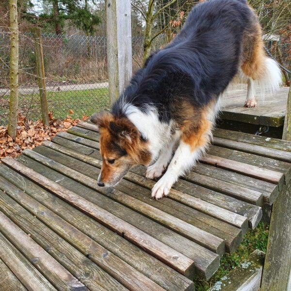 Danach fuhr Sonja mit Rosalie zum Hundeplatz. Anfangs war Rosalie noch etwas zurückhaltend, denn so gut kennt sie Sonja noch nicht, aber dann sauste sie munter über´s Gelände und genoss es, von einem Ende zum anderen zu rennen. Sie arbeitete mit Sonja an den verschiedenen Geräten und freute sich über die Leckerchen, die es dafür gab. 🙂