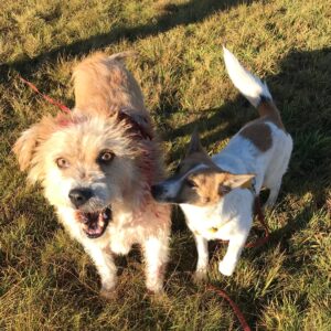 Mit Keksi und Trixie waren Theresa und Michi am Morgen zum ersten Mal spazieren. Beide laufen prima an der Leine und haben den kleinen Ausflug auf die Wiese in vollen Zügen genossen. 🙂 Leider hat sich Keksi beim Schütteln die Wunde an seiner Ohrkante aufgerissen und das blutete recht stark. Was aber seiner Freude über den Spaziergang überhaupt keinen Abbruch tat.