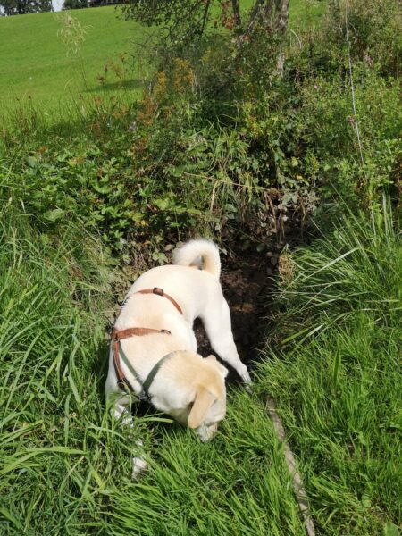 Mit Alaska war Karin danach rund um den Hundeplatz unterwegs. Am Bachweg ging sie ab und zu ins Wasser und frischte sich ab, am Waldweg schnüffelte sie intensiv den vielen spannenden Spuren nach. Bei Radfahrern hörte sie gut auf Karin und blieb nah bei ihr, wofür es auch das ein oder andere Leckerlie gab. 🙂