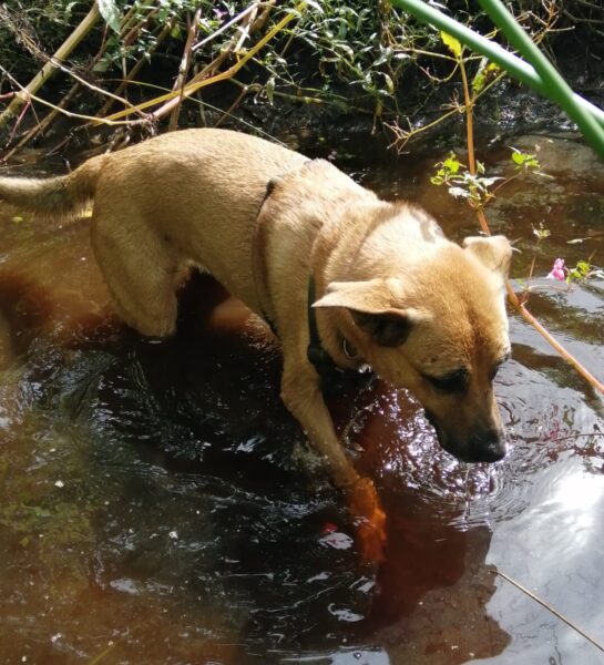 Renate und Jutta fuhren mit Momo und Aika nach Rottau zum Torfbahnhof. Gleich zu Beginn ihres Spaziergangs sahen sie in einiger Entfernung ein Reh am Rand eines Maisfelds, das sich durch die vier nicht stören ließ. Momo und Aika beobachteten gebannt das Reh, blieben dabei aber ganz ruhig. Als es endlich wieder im Maisfeld verschwand, gingen sie weiter und die Mädels schnüffelten eifrig den frischen Spuren nach. Dann gingen sie zum Plantschen in den Bach. Auch unterwegs gingen sie gerne ins Wasser, hatten viel Spaß bei einer Leckerliesuche und wollten viele Kuschelpausen einlegen. Zufrieden und gut gelaunt kamen sie zurück ins TierHeim. 🙂