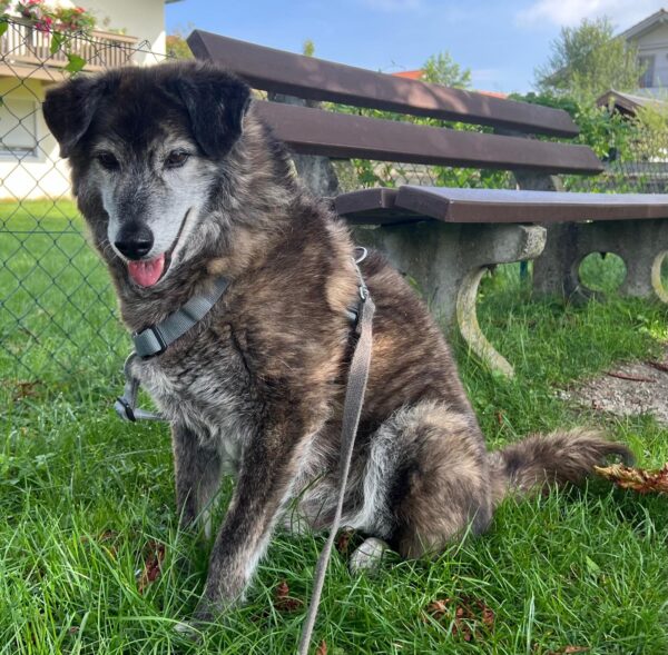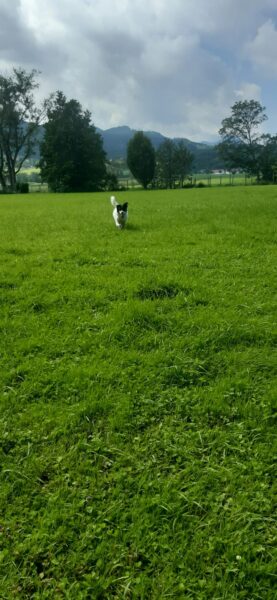 Sonja fuhr mit Sam nach Rottau, wo sie mit ihm spazieren ging. Wenn Fahrradfahrer kamen, wichen sie aus, wobei Sam ruhig blieb. Er war allgemein entspannt, genoss viele Kuschelpausen und badeten gerne im Bach. 🙂