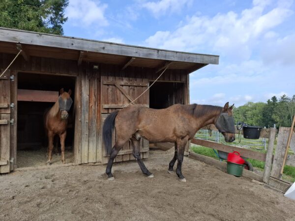Am Morgen versorgte Sonja die Pferde. Nach dem Fressen striegelte Sonja Wallace und Gowinda und kratzte ihnen die Hufe aus. Danach erledigte sie die üblichen Stallarbeiten, während die Pferde wieder auf die Weide gingen. Am Abend war Anna Maria im Stall, wo Wallace und Gowinda sie schon entspannt erwarteten und sich auf ihr Futter freuten. Während Anna Maria sich mit dem Bauer Ludwig unterhielt, blieb Gowinda bei ihnen stehen – als ob er ihnen zuhören würde, sooo niedlich. 🙂