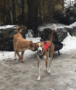 Henry hüpfte freudig an der Zimmertür auf und ab, als er Rita`s Auto vorfahren sah und seine Rute drehte sich vor Freude wie ein Propellor. Dani brachte ihn in den Auslauf, wo er sich über Leckerlies freute, die ihm Rita durch den Zaun steckte. 🙂