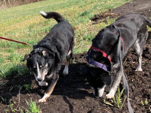 Mit Momo und Aika waren Doris und Dani auch am Vormittag unterwegs. Da noch nicht viel los war auf dem Radweg, gingen die vier ganz entspannt zu den Weihern bei der Raststätte. Momo und Aika knabberten an ausgesuchten Grashalmen, wälzten sich und schnüffelten viel herum. 🙂