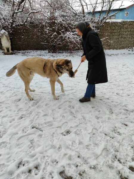Sophia fuhr mit Juri zu mir in den Innenhof, wo Juri wie immer zuerst die ausgelegten Leckerchen einsammelte. Dann fand er ein Spielzeug, das irgendein Hund liegen gelassen hatte und tobte damit begeistert herum. 🙂 Nach einer Weile forderte er mich zum Mitmachen auf, schaut mal: