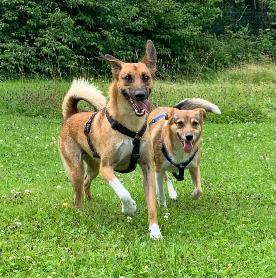 Rosalie und Diego waren richtig happy, als Elke in der Früh zu ihnen kam und ihnen ihr Frühstück brachte. Danach machten die drei einen entspannten Ausflug auf die große Wiese. Fröhlich stromerten die beiden durch das Gras und genossen danach Elke`s Kuscheleinheiten im Auslauf. 🙂