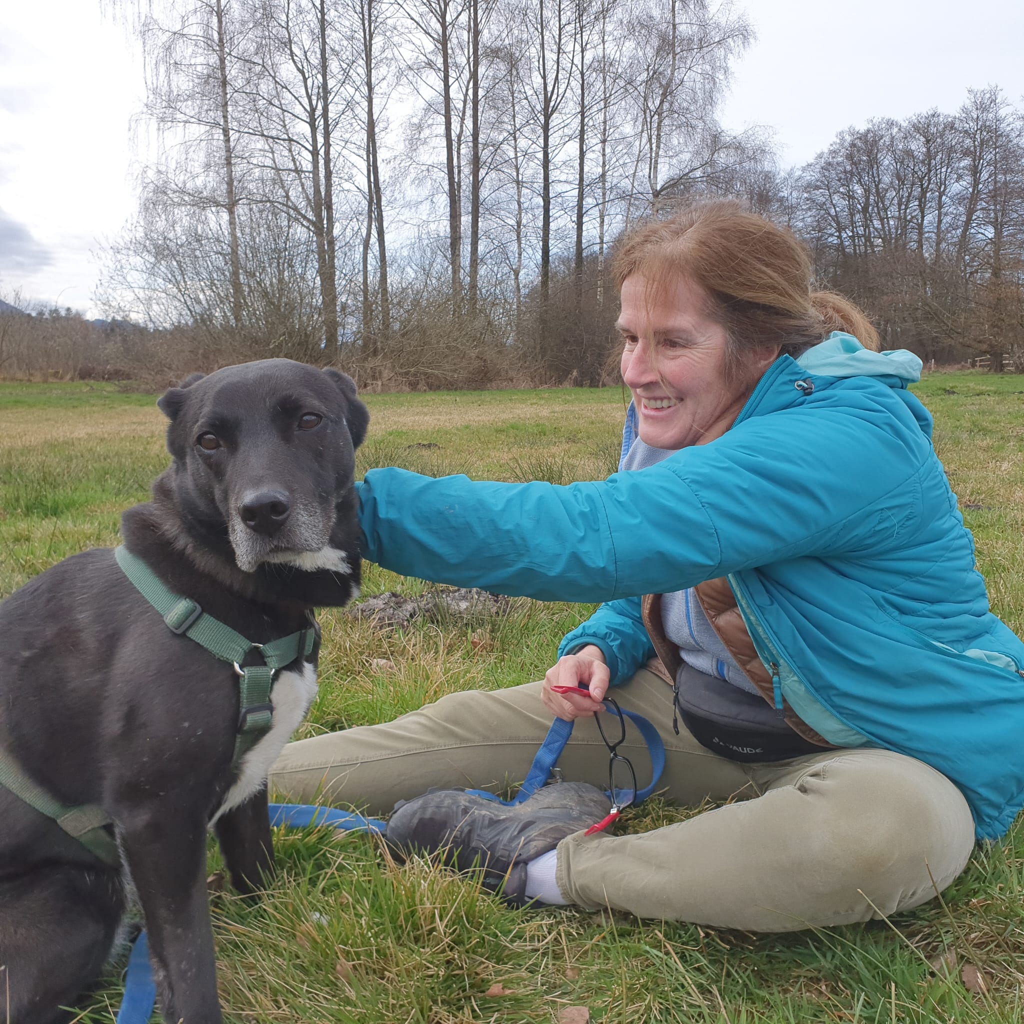 Sonja und Anna Maria gingen mit Momo und Aika in Richtung Übersee bis zu den Weihern und auf dem Rückweg auch noch auf die große Wiese und zum See dahinter. Momo und Aika waren sehr entspannt und schnüffelten gerne an den Mauselöchern, wälzten sie sich im Gras und genossen – wie alle Hunde heute – das schöne Wetter. 🙂