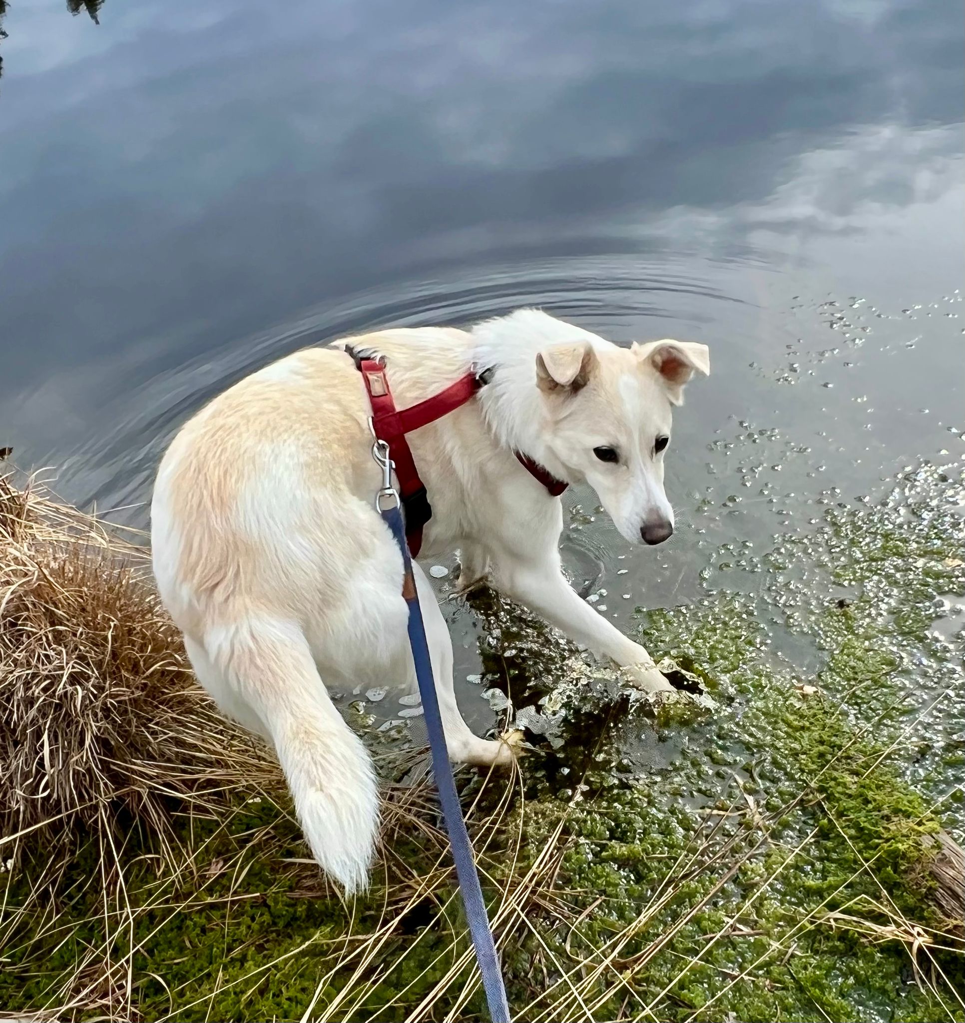 Anna Maria ging mit Santana auf die große Wiese. Auf dem Weg dorthin regte sich Santana wieder sehr über die Fahrradfahrer auf, aber auf der Wiese angekommen kam er bald zur Ruhe. Er erkundete die Spuren, schnüffelte dabei viel herum und freute sich über einen Abstecher zu dem kleinen See dahinter. 🙂