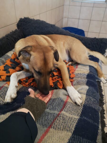Über lieben Kuschelbesuch von Karin freuten sich Flora, Fio, Grisu, Sam und Santana. Mit Flora und Grisu übte Karin außerdem weiter das Berühren und machte mit ihnen Geschirrtraining. Außerdem hatte sie für alle drei einen befüllten Schnüffelteppich dabei. 🙂