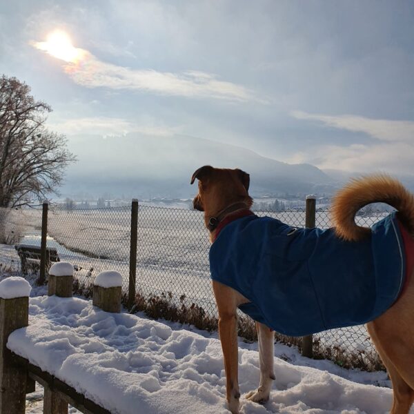 Jutta und Renate machten mit Momo und Aika einen langen Spaziergang. Sie bummelten in Richtung Übersee und liefen ein ziemliches Stück am Chiemsee entlang, wo die Mädels ungestört und ausgiebig schnüffeln konnten. Aika wälzte sich wohlig in der zugeschneiten Wiese. Momo genoss lieber Streicheleinheiten von Jutta und Renate. Sie haben den beiden auch immer mal wieder Leckerchen versteckt, die sie begeistert suchten. 🙂