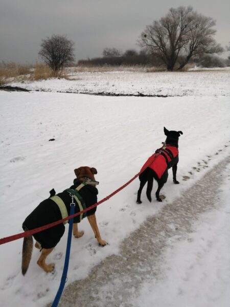 Mit Rina fuhr ich gleich in der Früh zum Maler Haas, wo wir ihre Interessenten und deren Rüden trafen. Wir gingen wieder gemeinsam spazieren und es zeigte sich, dass unsere vielen Treffen allmählich Wirkung zeigen. Rina war sehr entspannt – selbst wenn Mato sehr dicht an ihr vorbei ging, blieb sie ruhig und ein Mal schnüffelten sie sogar an der gleichen Stelle. Morgen treffen wir uns zum ersten Mal im zukünftigen Zuhause im Haus. Den Garten kennt Rina ja schon von mehreren Besuchen. 🙂