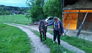 Als Michi morgens in den Stall kam, entdeckte sie Blutspuren im Stall von Wallace und Gowinda. Nachdem sie Wallace und Gowinda von Kopf bis Fuß untersuchte hatte, entdeckte sie, dass Gowinda sich am linken Vorderbein, etwa 5 cm über dem Huf, einen Schnitt zugezogen hatte, aus dem er blutete. Nach Rücksprache mit der Tierärztin wusch sie die Wunde gründlich mit fließendem Wasser aus. Mittags kam dann die Tierärztin um sich die Wunde genauer anzuschauen. Nachdem die Stelle so knapp über dem Huf war und die Gefahr, dass er sich durch Verschmutzung über die Erde mit Tetanus infizieren könnte, zu groß war, musste er eine Tetanus- Impfung bekommen. Nachdem Gowinda aber vor Panik völlig ausrastet, wenn er die Tierärztin mit einer Spritze sieht, ließ Gabi die Spritze da und Michi versuchte ihr Glück, nachdem sie wieder weg war. Aber alleine hatte sie keine Chance. Also kam Eva dazu und die beiden versuchten es zu zweit, aber Gowinda war so aufgeregt, dass er in Panik mit den Vorderläufen über die ca. 80 cm hohe Bande im Stall sprang. 🙁 Eva und Michi warteten wieder bis er sich beruhigt hatte und starteten den zweiten Versuch. Während Michi Gowinda festhielt und ihm Mash und Heucobs gab, setzte Eva gezielt und mit Schwung die Spritze. Gowinda tänzelte kurz vor Aufregung, so dass Eva noch warten mußte, bis er sich wieder beruhigt hatte, ehe sie das Serum rein drücken konnte. Ihn stört offensichtlich nur der erste Picks, denn beim Reindrücken war er völlig ruhig. Morgen muss er nochmal eine Spritze bekommen, dann erst wieder in 6 bis 8 Wochen.