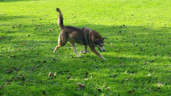 Lena freute sich sehr, als Conny vormittags mit ihr zum Hundeplatz fuhr. Oben angekommen schnüffelte sie ausgiebig herum und wälzte sich immer wieder wohlig im Gras. Einen Spaziergänger mit Hund verbellte sie, eine Joggerin verfolgte sie am Zaun, blieb dabei aber ruhig. Obwohl noch viel mehr Leute am Hundeplatz vorbei kamen, blieb Lena bei Conny, suchte nach Leckerlies und turnte über die Geräte. Während einer Verschnaufpause beobachtete sie aufmerksam eine Pferdekutsche, danach sauste sie wieder los, forderte Conny zum Spielen auf und rannte mit einem breiten Lachen in übermütigen Flitzeattacken kreuz und quer über das Gelände. 🙂