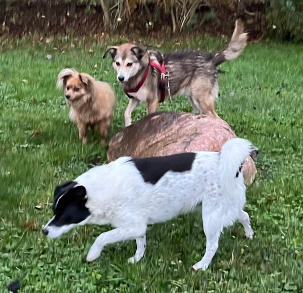Danach fuhr Sonja mit Percy, Nicky und Laluna in meinen Garten, die es super spannend fanden, im Unterholz herumzuschnüffeln und dort den Spuren anderer Tiere nachzugehen. Als sie den Mähroboter des Nachbarn entdeckten, beobachteten sie diesen höchst interessiert und teilweise mit schief gelegtem Kopf – sooo niedlich! 🙂