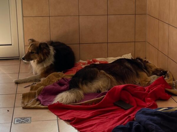 Der Tag ging schon sehr aufregend los. Doris war schon sehr früh im TierHeim, um die 6.00 Uhr Tabletten zu verteilen. Als sie etwas später Rosalie und Diego ihr Frühstück brachte, stellte sie gleich fest, dass etwas nicht stimmte. Diego wollte nichts fressen und versuchte mit der Pfote immer wieder, etwas aus seiner Schnauze zu holen. Doris war nicht sicher, ob ihn etwas gestochen hatte oder er sich etwas eingebissen hatte. Leider ließ Diego Doris nicht so nah an sich heran, dass sie genau hätte nachsehen können. Doris bat deshalb um Hilfe und Elke und Michi kamen kurz darauf ins TierHeim. Diego vertraut Elke so sehr, dass sie nachsehen durfte was los war und so entdeckte Elke ein Stück Holz, das er sich weit hinten eingebißen hatte. Sie durfte Diego sogar ins Maul fassen, aber leider saß das Holz so fest, dass sie es so nicht heraus bekam. 🙁 Michi rief in der Klinik an und Hedda konnte sofort losfahren, um ein Narkosemittel abzuholen. Während Hedda unterwegs war, blieb Elke bei Rosalie und Diego im Zimmer. Man merkte Diego an, dass er wußte, dass Elke ihm helfen will. Er ließ sich zum ersten Mal richtig von ihr streicheln 🙂 So toll! Auch als Diego seine Narkose gespritzt bekam, ließ er sich streicheln und zeigte uns deutlich, dass es in Ordnung ist und er weiß, dass ihm geholfen wird. Ein sehr berührender Moment. 🙂 Als Diego schlief, konnten Michi und Elke das Stück Holz endlich entfernen. Es saß so fest, das Michi richtig Kraft brauchte, um es heraus zu holen. Danach wurde Diego gegengespritzt, damit er sanft wieder aufwacht. Elke blieb die ganze Zeit bei Diego und Rosalie und erst als er wach war und auch etwas gefressen hatte, fuhr sie wieder. Diego war sichtlich erleichtert, dass er das Stück Holz los war und auch Rosalie, die mit ihrem Hundefreund mitgelitten hatte, kam wieder zur Ruhe. 🙂