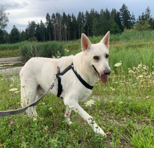 Mit Grey fuhr Evi zum Hundeplatz. Dort drehten die beiden eine kleine Runde, aber es war leider viel zu warm. So ging Evi mit Grey lieber den Waldweg entlang, wo es schön schattig war, was Grey super fand! Mit der Nase am Boden wurde alles genau erkundet. Die beiden gingen auch noch ein Stück in den Wald hinein und dann langsam wieder zurück. Grey fand es so toll, dass er am liebsten noch lange weiter gelaufen wäre. 🙂