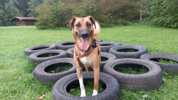 Conny fuhr mit Rosalie auf den Hundeplatz. Rosalie war richtig verspielt und flitzte gut gelaunt von einem Gerät zum anderen. Auch während der Leckerliesuche in den Reifen strahlte sie vor Freude. Zurück im TierHeim ging sie noch in den Auslauf, wo sie sich auf das Holzpodest legte und die Geschehnisse im Hof beobachtete. 🙂