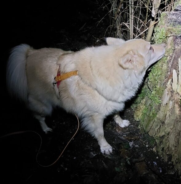 Kaya freute sich über einen schönen und langen Spaziergang mit Jutta zum Waldweg hinter der Raststätte, wo Kaya intensiv den Spuren von Momo und Aika nachschnupperte. Immer wieder schaute sie nach links und rechts in den Wald, wälzte sich fröhlich in den Schneeresten am Wegesrand und freute sich über Leckerliesuchen. Sie war richtig gut drauf und entspannt und wenn Jutta sie ansprach, reagierte sie gleich, kam zu ihr und blieb bei den doch recht vielen Radfahrern heute sehr brav und gelassen. Es war ein schöner Spaziergang für die beiden! 🙂