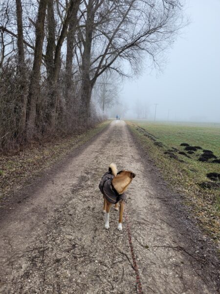 Ella durfte auch heute wieder mehrere kurze Spaziergänge machen. Alex ging gleich in der Früh mit ihr, etwas später gingen Michi und David mit Interessenten und deren Hündin ein Stück mit ihr, am Mittag war David mit Ella unterwegs und nachmittags ging Michi mit ihr und weiteren Interessenten eine kleine Runde. So sehr sich Ella jedes Mal freute, wenn sie raus durfte, so gern ging sie auch wieder zurück, denn es war den ganzen Tag über eiskalt und durch den Nebel, der sich hartnäckig hielt, fühlte sich die Kälte gleich nochmal ärger an. Aber es war in jedem Fall ein abwechslungsreicher Tag für Ella. 🙂