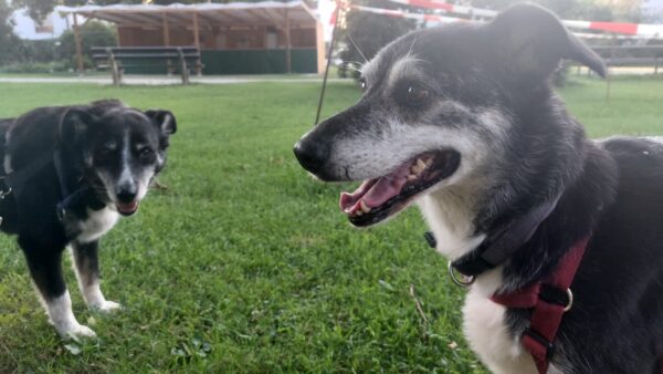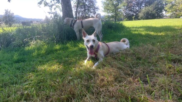 Momo und Aika freuten sich, als Jutta kam und mit ihnen nacheinander in Richtung Übersee zum See ging. Sie badeten dort gerne, aber schnupperten auch voller Elan am schattigen Waldrand. Während der Pausen im Schatten hat Jutta mit ihnen gekuschelt und zum Abshluß gab es jeweils eine Leckerliesuche. 🙂