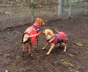 Sehr niedlich zu beobachten ist Nele, wenn sie im Nachbarauslauf Gandalf sieht, den sie durch den Zaun anflirtet. 🙂