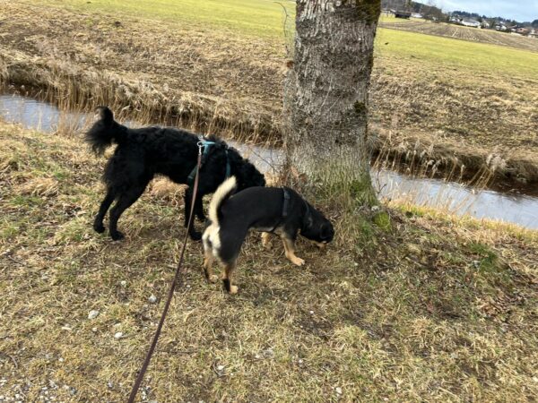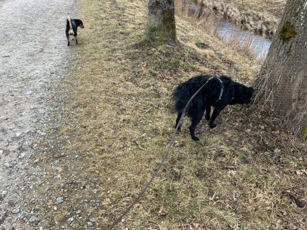 Anna Maria ging mit Resi und Franzi bis zur zweiten Bank in Richtung Bernau. Zwischendurch stöberte Franzi im Gebüsch und freute sich über eine Leckerliesuche am Stromhäusl. Die letzten Meter auf dem Rückweg wurden beide gaaaanz langsam, sie hätten den Spaziergang (und die Leckerliesuchen 🙂 ) trotz der Wetterkapriolen gern noch ein wenig verlängert. 🙂