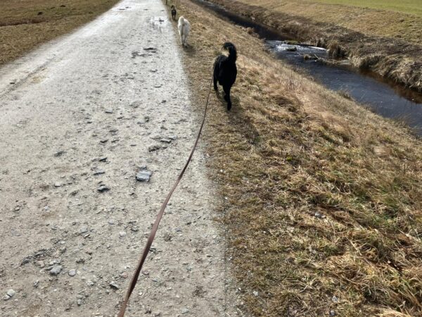 Jeanne war mit Lucky 2.0 auf dem Hundeplatz und weil es einen krassen Schneeregen gab, wollte sogar Lucky mal still unter dem Hüttendach sitzen und sich das Unwetter aus dem Trockenen heraus anschauen. Kurz darauf holte ich Jeanne und Lucky mit meinen Hündinnen zum Trainingsspaziergang ab. Diese Runden laufen immer besser, Lucky ist längst nicht mehr so aufgeregt und aufdringlich. Zwei, drei Mal schaffte er es sogar, in aller Ruhe mit ihnen am gleichen Spot zu schnüffeln – daran war vor ein paar Wochen noch nicht zu denken… 🙂