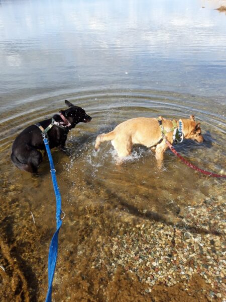 Renate und Julian machten mit Momo und Aika einen langen Spaziergang. Zuerst stromerten sie auf dem Waldweg entlang, danach liefen sie weiter zum Chiemsee. Die Mädels schnupperten eifrig im Wald und über die Wiesen und am See gingen sie gleich zum Pritscheln ins Wasser und läuteten so die Badesaison ein. 🙂 Erfrischt suchten die beiden danach Leckerlies und genossen beim Sonnenbaden ausgiebige Streicheleinheiten. 🙂