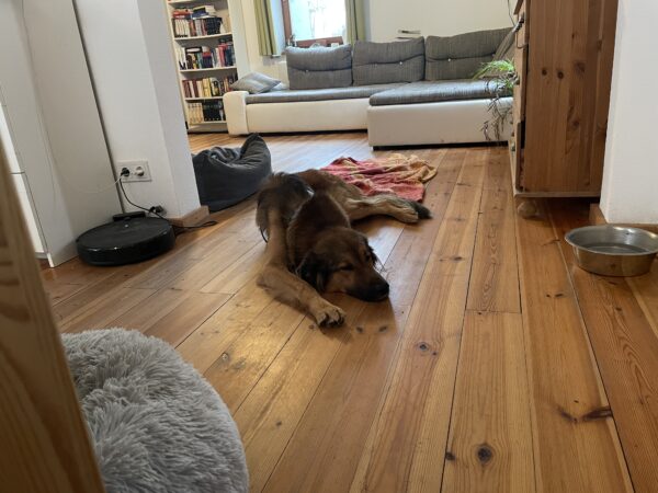 Dann fuhr Michi mit ihm in sein zukünftiges Zuhause, wo er den Kater Silvester kennenlernte. Schon beim Hineingehen in die Wohnung sah er den Kater, der im Vorraum saß und sich erstmal erschrak, weil ein fremder Hund zur Tür hereinkam und deshalb fauchte. Yuno beschwichtigte und drehte ab. Großartig! 🙂 Als der Kater in die Küche ging, schnupperte Yuno erst eine Runde durch die Wohnung. Der Holzfussboden war ihm anfangs etwas unheimlich, das legte sich aber rasch. Dann beobachtete er ruhig den Kater, der mittlerweile auf der Küchenarbeitsfläche saß. Schließlich ging er zu ihm hin und beschnupperte ihn. Yuno war so entspannt, dass wir seine Leine abmachen konnten. Wir ließen ihm etwas Zeit sich umzuschauen, danach legte er sich entspannt auf den Boden und schloß sogar die Augen. 🙂 Danach gingen Michi und Anja mit ihm und Anja’s Hündinnen Kisha und Coco spazieren. Die Wiedersehensfreude aller drei Hunde war groß! Nach dem Spaziergang gingen alle gemeinsam in die Wohnung und sogar Coco, die immer lange braucht, ehe sie fremde Hunde in ihrer Wohnung akzeptiert, war richtig freundlich zu Yuno. Erst legte sie sich in ihr Kröbchen und behielt Yuno genau im Auge, sie sagte ganz deutlich: Das ist meins! Dann kam sie aus dem Körbchen raus, ging zu Yuno und warf sich vor ihn auf den Boden, richtig süß! Nachdem sich die beiden im Wohnzimmer beschnuppert hatten, ging Coco wieder in ihr Körbchen und wieder sagte ihr Blick deutlich: Aber hierhin nicht! Wir sind zuversichtlich, dass Coco Yuno in ihrem Zuhause akzeptieren wird, werden aber beiden Hunden die Zeit geben, sich langsam aneinander zu gewöhnen. Kisha war völlig entspannt, als Yuno mit in der Wohnung war. 🙂