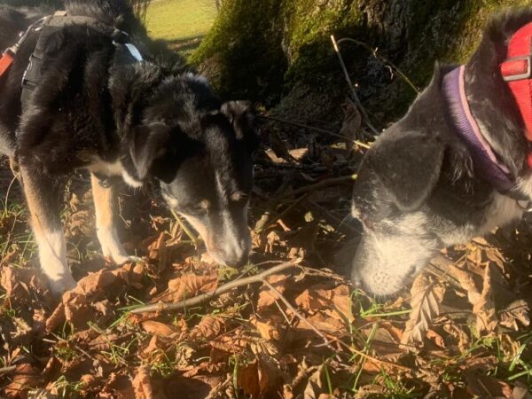 Em und Elfriede fuhren mit Resi und Franzi zum Kurpark, wo sie einen tollen Spaziergang machten. Die Mädels waren bester Laune, schnupperten die Wege ab, kruschtelten durch`s Laub und fanden schöne Stöcke zum Spielen, die sie auch durch die Luft wirbelten. Natürlich gab es auch Leckerliesuchen und zwischendrin wurde ausgiebig gekuschelt. 🙂
