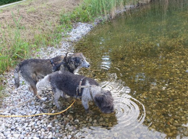 Danach gingen Julian und Renate gemeinsam mit Momo und Aika zum Förchensee. Beide verbellten Fußgänger, die komplett in schwarz gekleidet auf sie zu kamen. Beim dritten Fußgänger, der ebenfalls komplett in schwarz gekleidet auf sie zu kam, konnte Renate sie aber schon vorher beruhigen und so lief diese Begegnung entspannt ab. 🙂