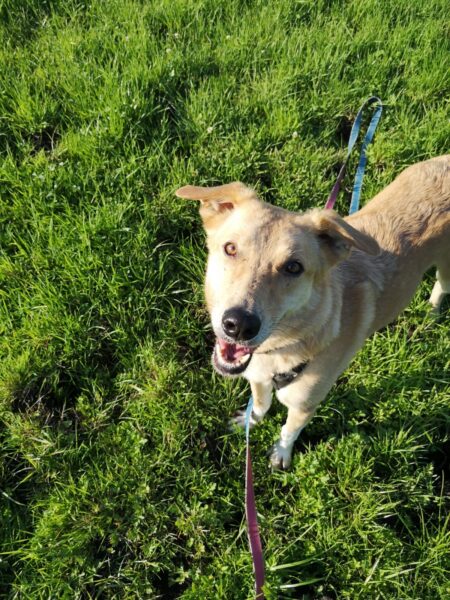 Mit Percy war Karin auf der großen Wiese rechts vom TierHeim. Dorthin geht Percy lieber, weil die Autobahn da nicht ganz so laut ist. Er lief gut mit, freute sich über eine Leckerliesuche und kam freudestrahlend zurück. 🙂