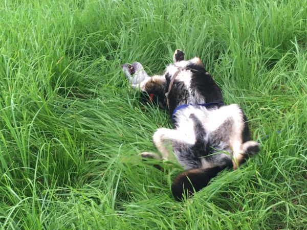 Nero freute sich über einen Spaziergang mit Robert. Er lief freudig zum Hoftor und durfte die Richtung aussuchen. Er wollte nach links auf die große Wiese. Neugierig schnupperte er im gemähten Teil durch das Gras, den anderen Teil vermied er, vermutlich, weil das hohe Gras so nass war. Schließlich blieb er stehen, umrundete Robert und zeigte ihm so, dass es nun an der Zeit für ein Leckerlie ist. Danach legte er sich entspannt auf die Wiese und drehte Robert seinen Bauch zum Kraulen zu. 🙂 Nach einer Kuschelpause gingen die beiden gemütlich zurück ins TierHeim, wo Nero sich zufrieden in sein Körbchen legte. 🙂