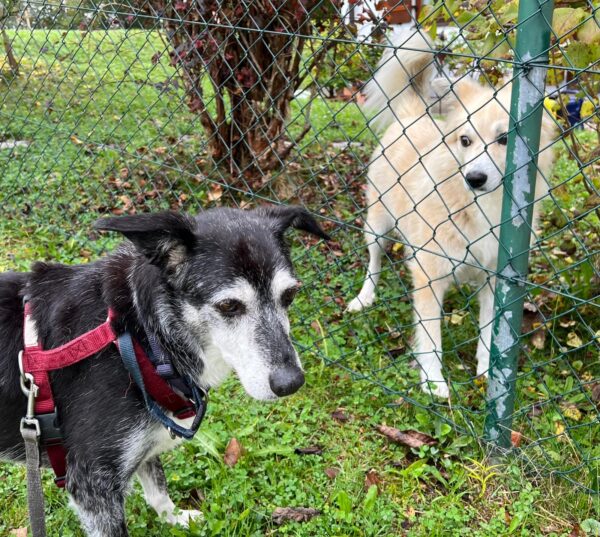 Mit Resi und Franzi fuhren Em und Elfriede gleich danach in den Kurpark. Die Mädels raschelten gut gelaunt durch das Laub und wälzten sich dann wohlig darin. Als sie beim Herumschnüffeln Steve in seinem Garten sahen, wollten sie gleich zu ihm und alle drei begrüßten sich freundlich. Nach einer Weile liefen sie zufrieden weiter und freuten sich über eine Leckerliesuche und viele Streicheleinheiten. 🙂