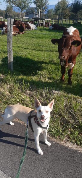 Dagmar und Fred gingen mit Resi und Franzi auf die große Wiese und – nachdem Resi und Franzi diese ausgiebig abgeschnüffelt hatten – weiter in Richtung Übersee. Resi und Franzi kannten Dagmar und Fred noch nicht besonders gut, gingen aber trotzdem ganz entspannt mit ihnen mit. Sie freuten sich unterwegs auch über Leckerchen und Streicheleinheiten. 🙂